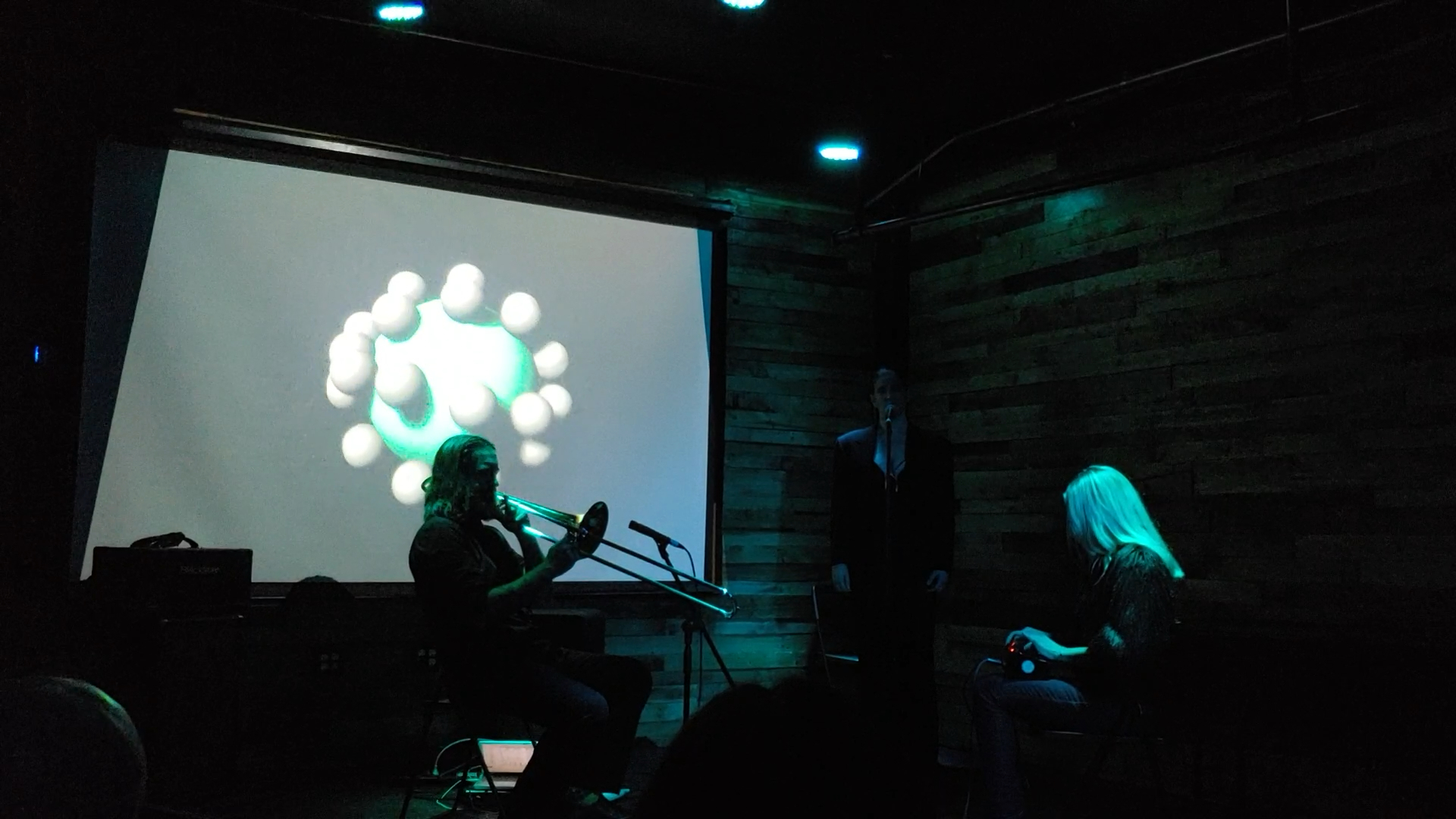 Melissa Grey & David Morneau, Jessica Bowers, and Marc Fiaux performing for 'PETITE ecstasy' release party at Pine Box Rock Shop.